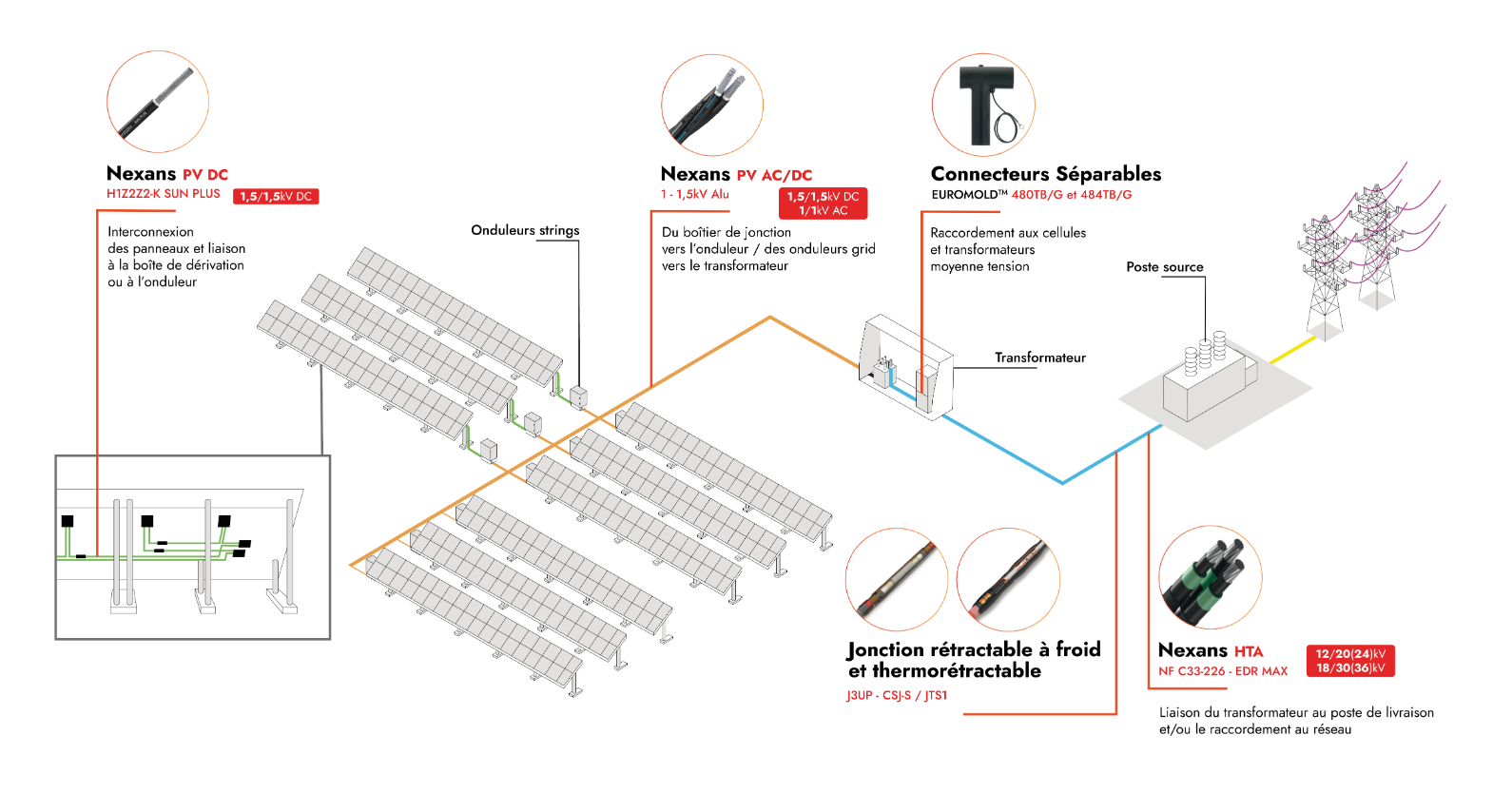 - Solutions combinant des câbles et des accessoires, depuis la connexion des modules jusqu’à l’injection sur le réseau