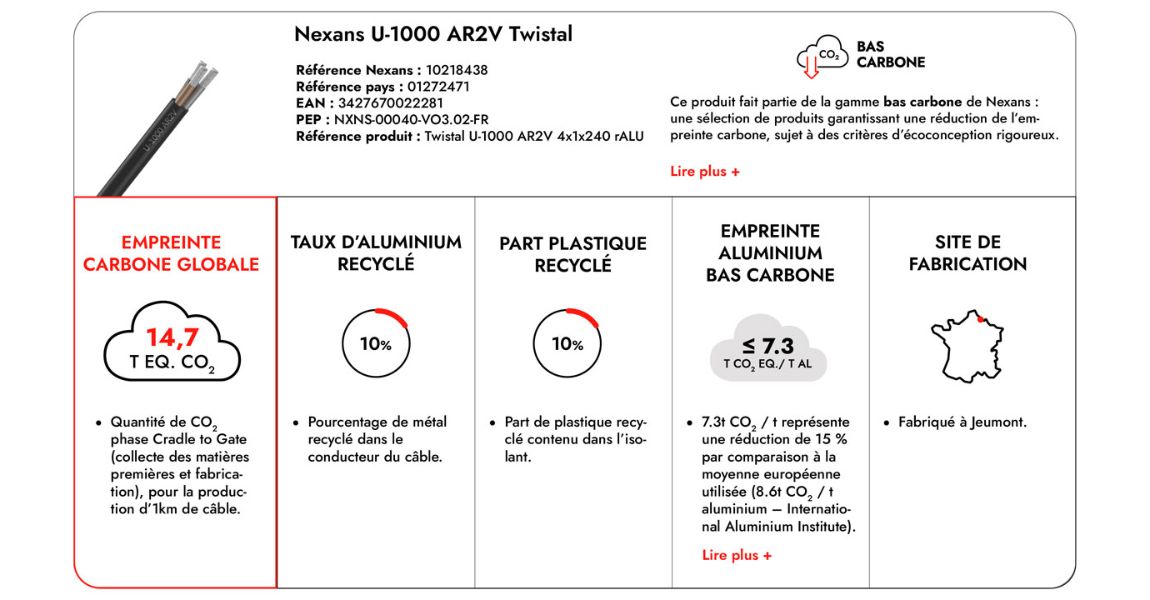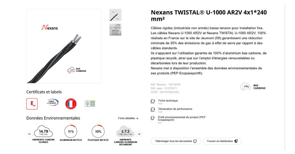 Le programme Bas Carbone est une démarche d’innovation continue pour améliorer la performance environnementale des produits et services de Nexans, en s’appuyant sur la transparence de la donnée environnementale. Déployé à l’échelle mondiale, ce programme s’applique à l’ensemble des références Nexans disposant d’une analyse de cycle de vie (ACV). C’est dans le cadre de ce programme inédit que Nexans a mis en place le premier affichage environnemental des données CO₂ de ses produits, facilement accessible depuis les fiches techniques des produits disposant d’une ACV certifiée. Une initiative pionnière dans l’industrie du câble.