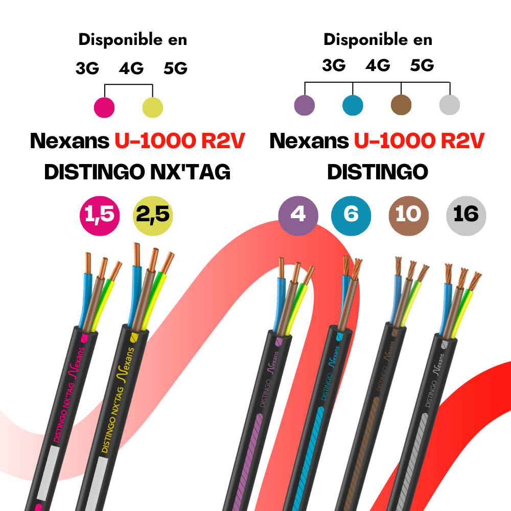 - La gamme Nexans U-1000 R2V DISTINGO NX'TAG, fabriquée en France, pour les sections de 1.5 et 2.5mm2, de 3 à 5 conducteurs, avec les mêmes caractéristiques. Une zone de marquage permet d’identifier chaque câble et sa destination lors de l’installation.