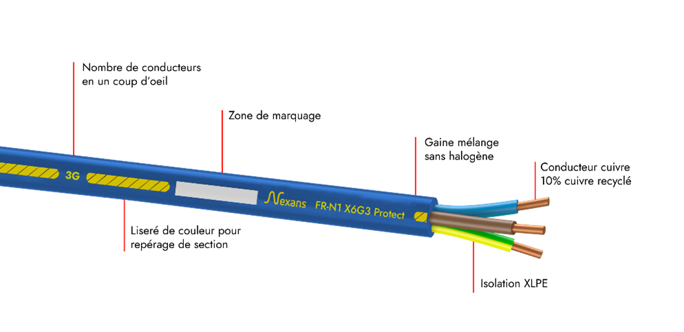 Les câbles Nexans Nexans FR-N1 X6G3 PROTECT, disponibles en sections 1,5 à 240 mm² et de 1 à 5 conducteurs, ont été conçus pour être non propagateurs de l'incendie, sans halogène, et dégagent peu de fumées en cas d'incendie. Les gaz émis sont ni acides, ni corrosifs . Grâce à leur excellent comportement au feu (Cca-s1,d2,a1), ils sont particulièrement adaptés aux bâtiments critiques comme les ERP et IGH. Ils peuvent être aussi utilisés dans les établissements recevant des travailleurs (ERT) ou dans les logements.