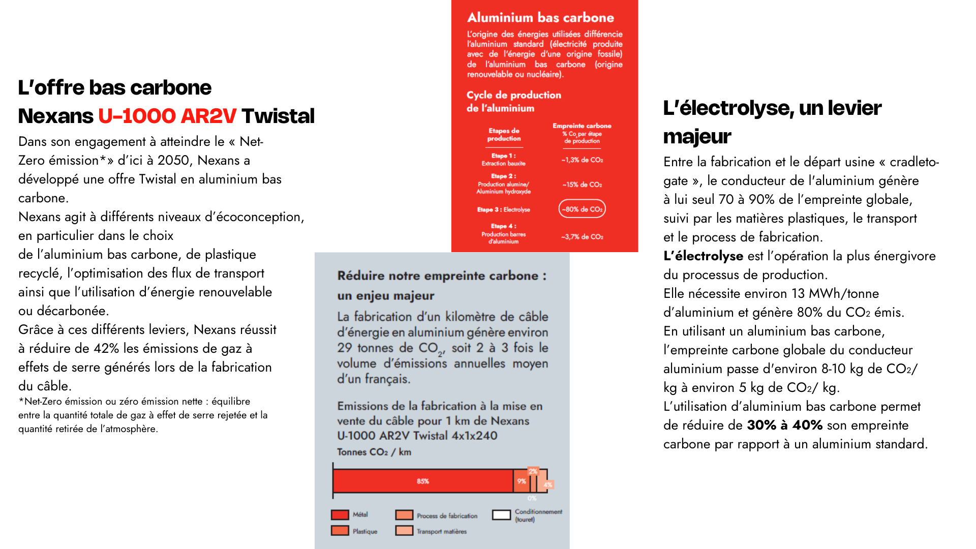 Les câbles Nexans U-1000 AR2V et Nexans TWISTAL U-1000 AR2V, 100% réalisés en France sur le site de Jeumont (59) garantissent une réduction minimale de 35% des émissions de gaz à effet de serre par rapport à des câbles standards.